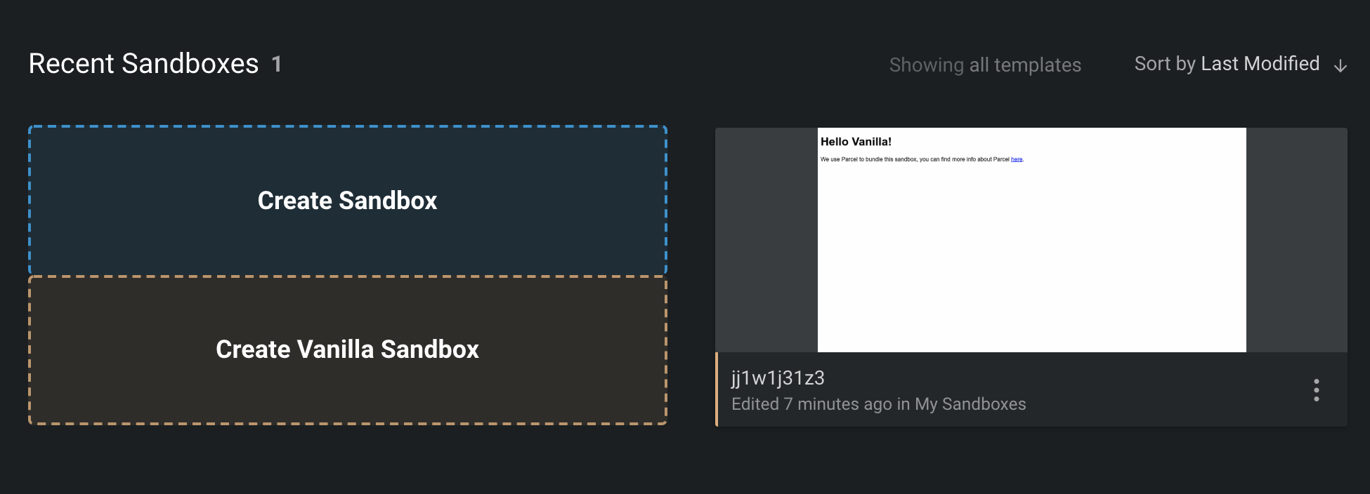 테스트용 프로젝트를 생성하므로 코드 샌드박스(http://codesandbox.io)에서 parcel을 사용한 바닐라 자바스크립트 프로젝트를 하나 만들어줬다. 생성된 프로젝트를 Github과 연동할 수 있으나, 로컬에서 작업하는 것이 더 편해서 zip 파일로 다운, 압축 해제 후 만들어둔 Github 레포지터리에 업로드했다.