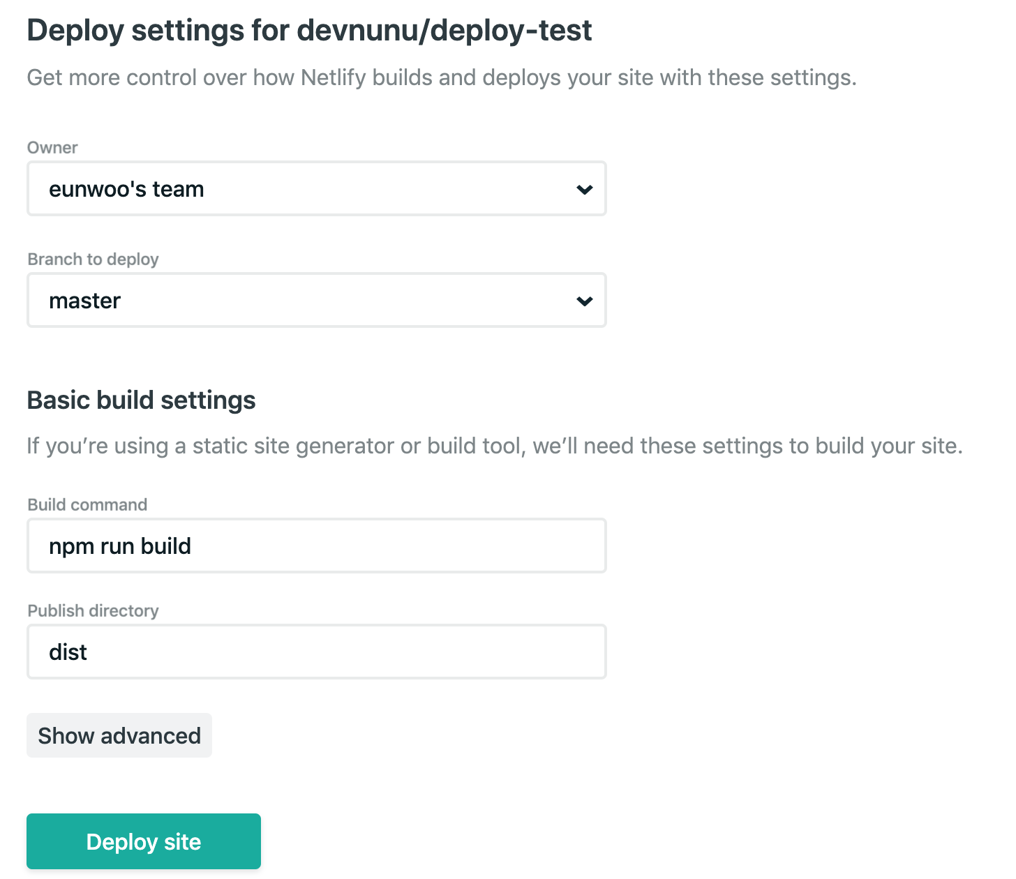 프로젝트가 Github에 올라가 있다면 자동으로 Owner와 Branch to deploy 값을 채워진다. 우리가 설정해야 될 것은 Basic build setting인데, 정적 파일을 생성하기 위한 빌드 스크립트와, 정적 파일이 생성되는 디렉터리의 이름을 지정해주면 된다. 앞서 package.json을 살펴봤을 때 빌드를 위한 스크립트는 npm run build 였고, 그 결과는 dist 폴더에 저장된다. 따라서 이와 같이 입력을 해준다.