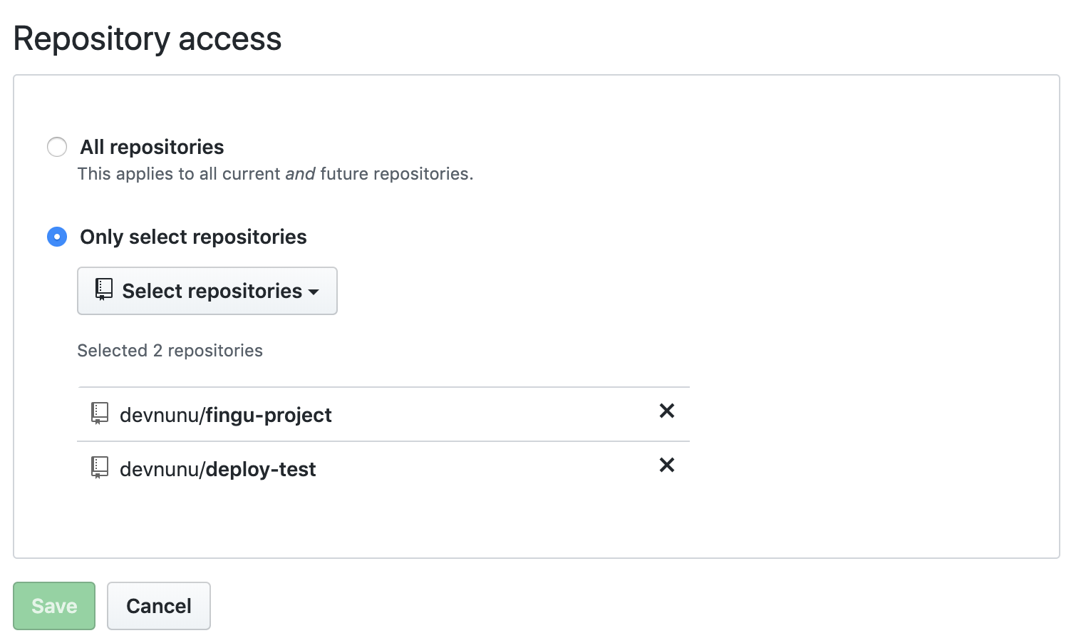 다음으로 레포지터리 액세스 권한을 설정해준다. 모든 레포지터리에 대해 권한을 부여할 필요가 없으므로, 배포가 필요한 프로젝트만 선택해준다. 방금 만들어둔 deploy-test를 추가해줬다.