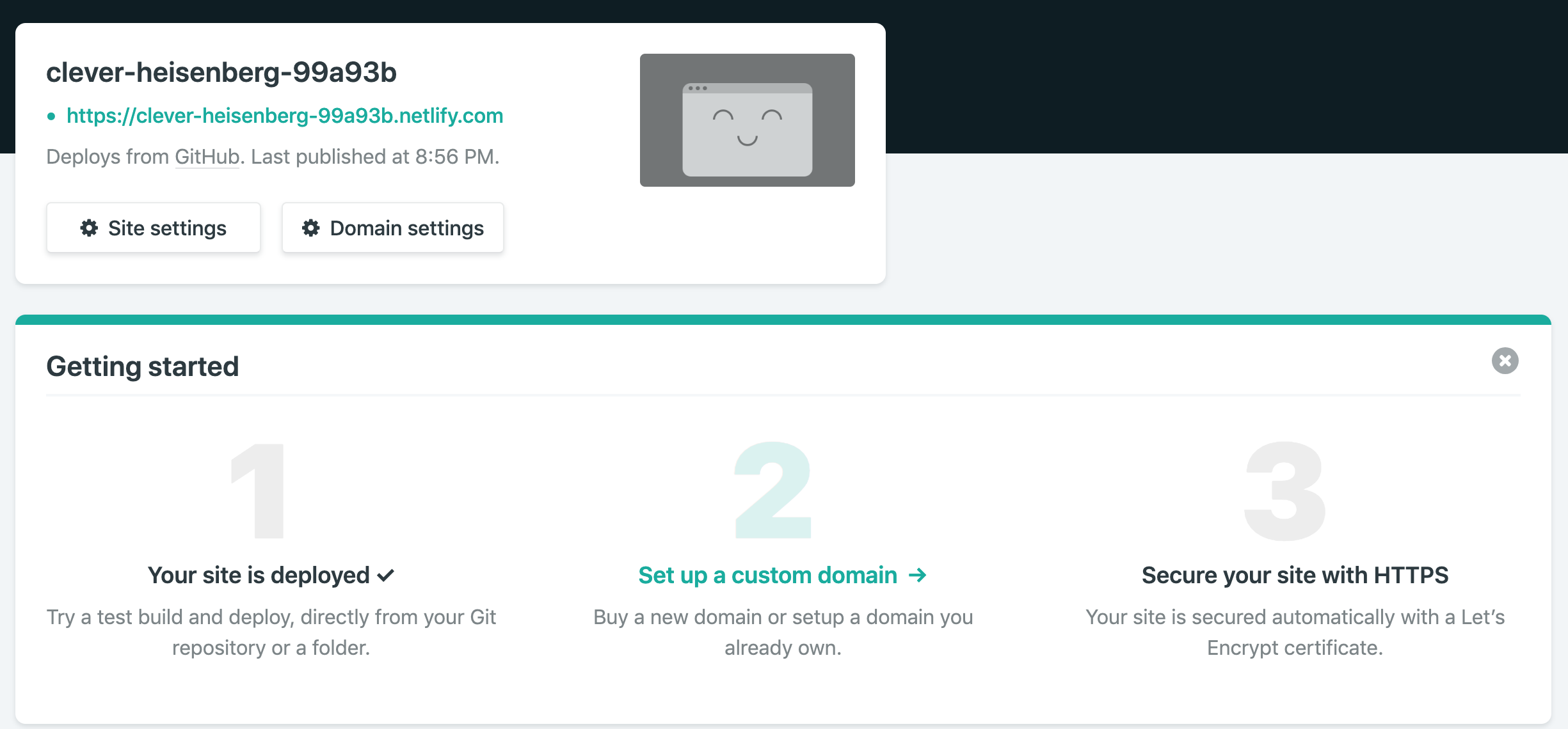 배포가 성공되면 Your Site is deployed에 체크가 된다. 이후에 도메인을 커스텀으로 설정하고 https를 설정할 수도 있으나, 필요 없으니 건너뛴다. 상단의 카드뷰 안의 링크는 내 정적 페이지가 배포된 주소이다. 클릭해서 잘 배포됐는지 확인해보도록 하자