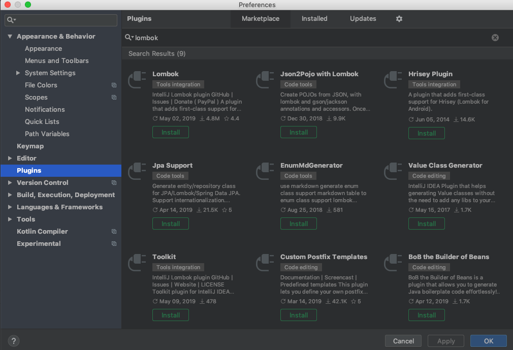 - 맥 기준 Android Studio -> Preference -> Plugins에서 lombok을 검색한다.