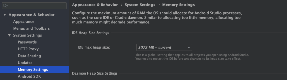 - 맥 기준 좌측상단 Android -> Preference -> Appearance & Behavior -> System Settings -> Memory Settings에 들어간다.