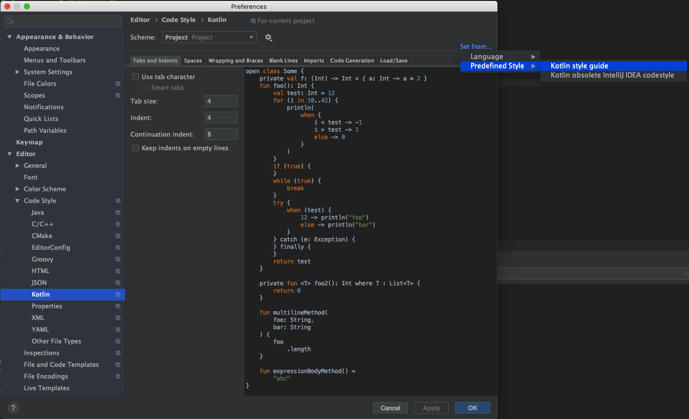 이 스타일 가이드에 따라 IntelliJ 포맷터를 구성하기 위해서는 Kotlin 플러그인 버전 1.2.20 이상을 설치하고, Setting -> Editor -> Code Style -> Kotlin -> set from... 을 선택하세요. 그리고 메뉴에서 Predefined Style -> Kotlin style guide를 선택합니다.
