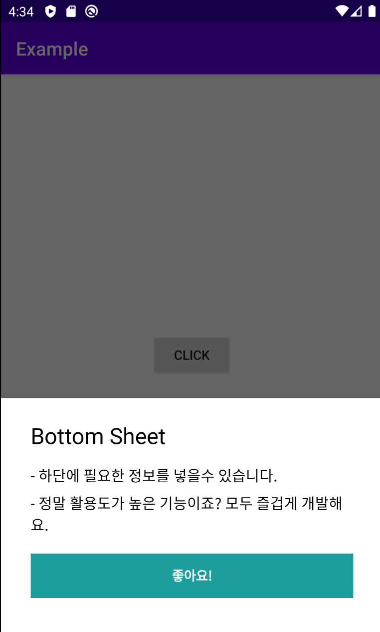 Bottom Sheet을 여는 기본 코드는 더더욱 단순하다. 그저 버튼이 클릭 되었을때 다이얼로그를 열듯, 인스턴스를 생성해서 show 함수를 호출해주기만 하면 된다. 결과는 아래와 같다.